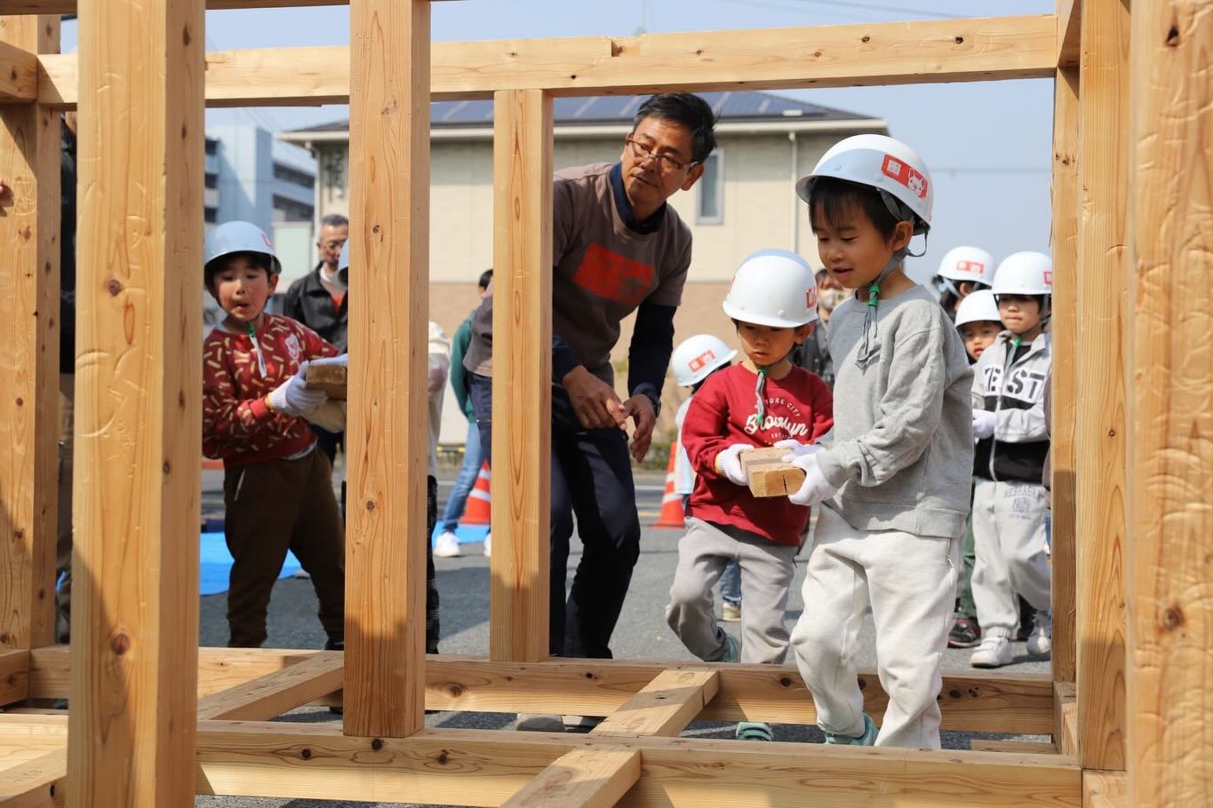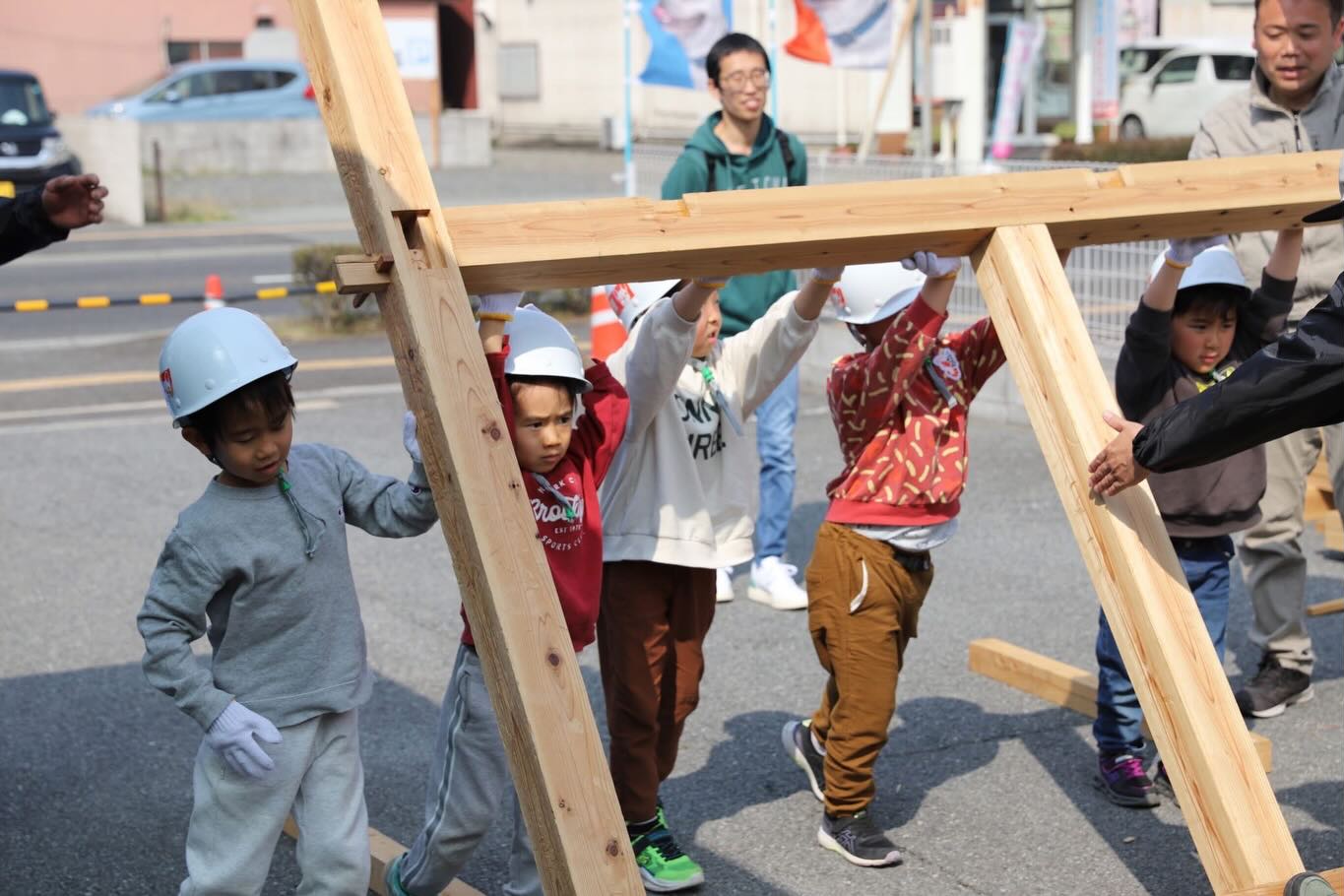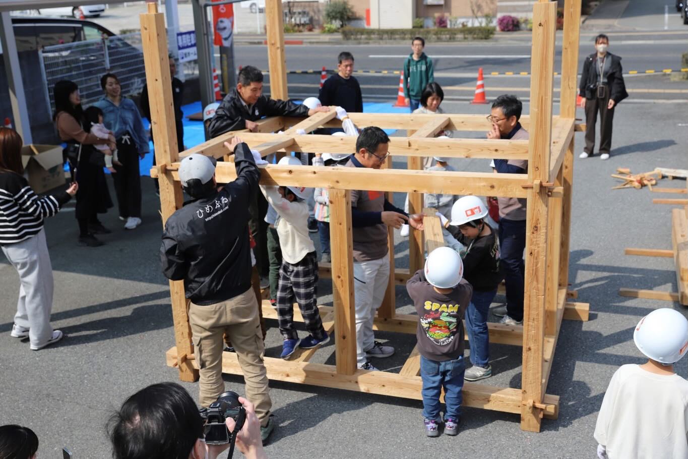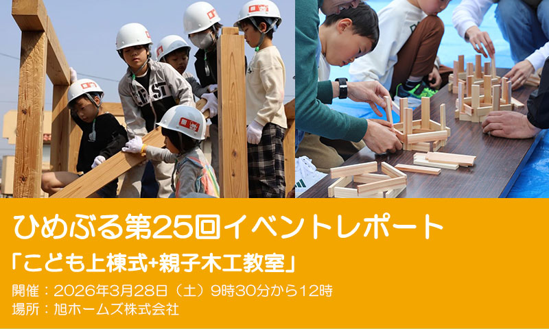 2026年03月31日 第25回イベントレポート 2026年3月28日(土)に第25回ひめぶるイベントの「子ども上棟式」をメンバーの会社 旭ホームズ㈱ で開催しました。 14名の子供達が力を合わせて小さい家を建てました。 今回も前を通る車の中から、地域の方が足を止めて眺めたりと、子供達が楽しく上棟体験をしているのを見ていただきました。 また、第25回ひめぶるイベントでは「子ども上棟式」以外にも親子で木工教室で「お箸作り」と積み木で木の強さを体験しました。 マイ箸作りは、鉋(かんな)とやすりを使って細さや丸みを自分好みで作っていました。 また、同じサイズの積み木で接着剤や金物を使わずに組むだけで強度が出ることを体験しました。 どちらも親子で楽しく体験されていました。