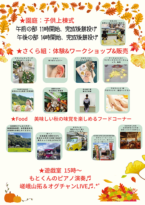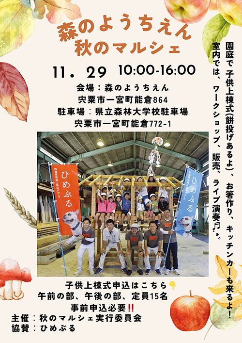 森のようちえんが開催する秋のマルシェで、ひめぶるが子供上棟式とお箸つくりを行います。